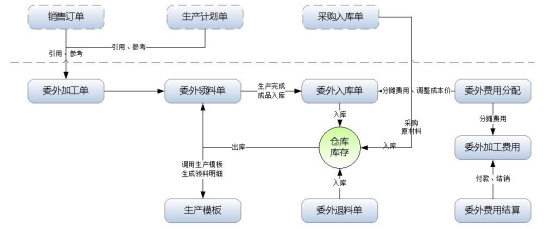 ????對委外加工需要我們提供原材料(即我們采購的原材料),需代加工廠生產時,我們出庫運送給代工廠(也有可能采購的原材料直接存放在代加工廠倉庫),這種業務模式軟件也提供了較好的支持。