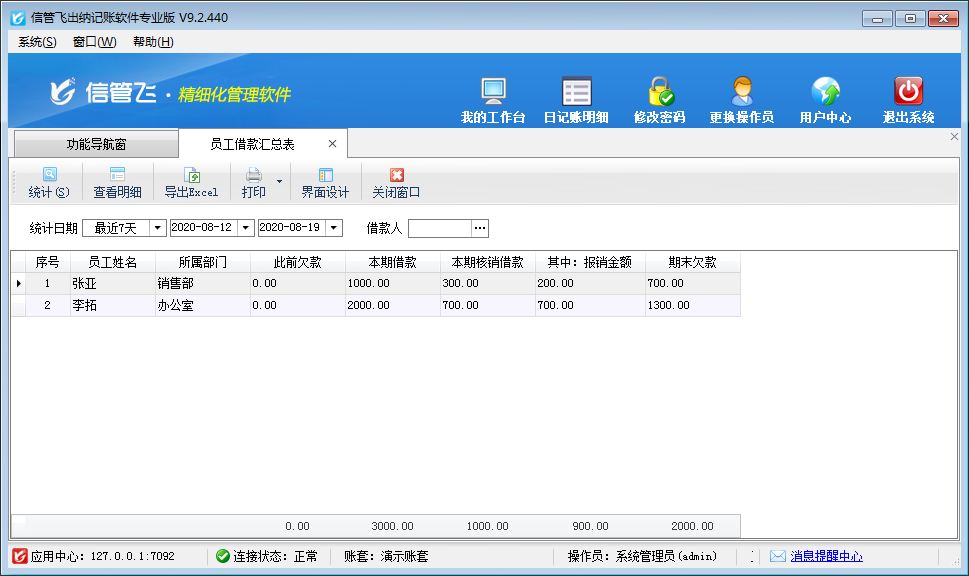 ????出納記賬軟件專業版的員工借款管理及還款管理功能可以對企業員工借款、還款進行流程化登記管理,提高了企業管理效率。員工借款匯總表可根據統計日期、借款人等條件來進行統計每個員工的借款及核銷情況,包括員工的此前欠款、本期借款、本期核銷金額及期末欠款等信息,本文詳細介紹一下如何查詢員工借款及核銷情況?