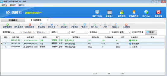 ????在功能導航窗點擊“綜合管理”—》“員工借款管理”即可進入“員工借款管理”界面,如下圖所示: