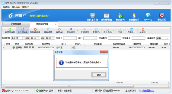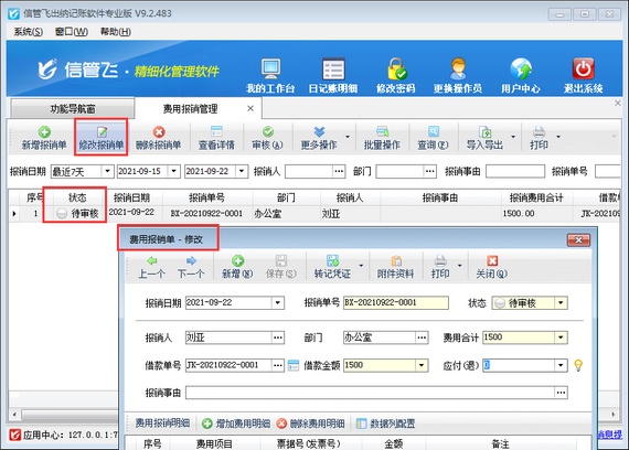 ????在日常工作中,因為臨時事件的發生,員工經常會自己墊付工作所需要的各項費用。這些費用在月末時可以填寫費用報銷單進行統一的報銷。信管飛出納記賬軟件專業版有費用報銷管理功能,可以管理費用報銷單。