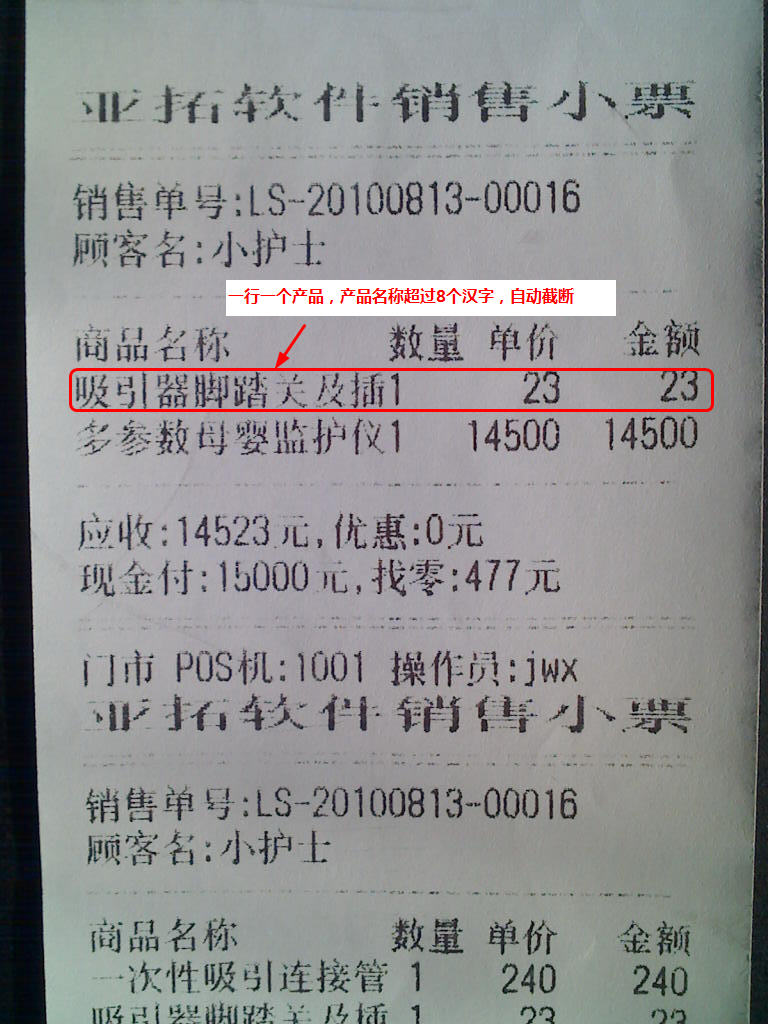 POS銷售開票支持的打印格式,主要有以下三種:(1)商品名稱+數量+單價+金額(2)商品編號+數量+單價+金額(3)商品名稱+商品編號+數量+單價+金額 用戶可在POS銷售終端系統或者紅管家進銷存管理系統增強版的“POS系統參數及硬件設置”功能中進行設置,如下圖所示: 其中,是否打印銷售流水號、是否打印顧客名、是否打印門店名稱、POS機代碼、操作員、時間都可以進行設置,打勾則系統會打印,不打勾則系統不打印。另外,系統也允許設置小票標題和附注,具體對應小票大哪個位置,請參見下