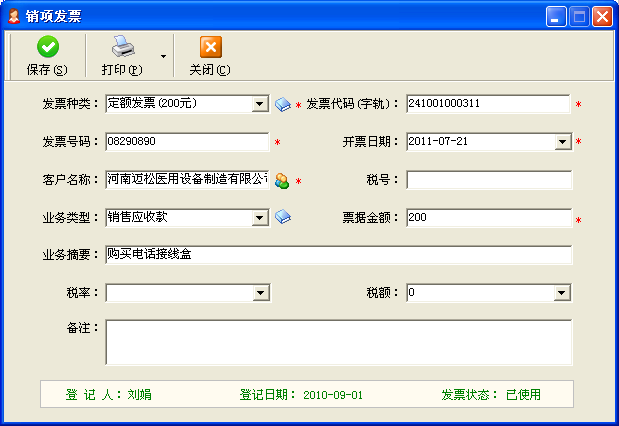 一、發(fā)票的登記銷項發(fā)票目前主要分為定額發(fā)票、增值稅發(fā)票、一般機打發(fā)票三種,公司會計人員在稅局購領后,需要在第一時間內(nèi),在《紅管家財務出納記賬系統(tǒng)》中進行登記。主要登記信息包括:發(fā)票種類:定額、增值稅、一般發(fā)票(手開/機打)。發(fā)票字軌:即發(fā)票代碼頭,本批發(fā)票前綴相同的特定字符。起始號碼:數(shù)字,用于批量生成發(fā)票號碼。發(fā)票張數(shù)購買日期及購買人發(fā)票樣本附件 二、發(fā)票的申領(1)部門負責人和銷售經(jīng)