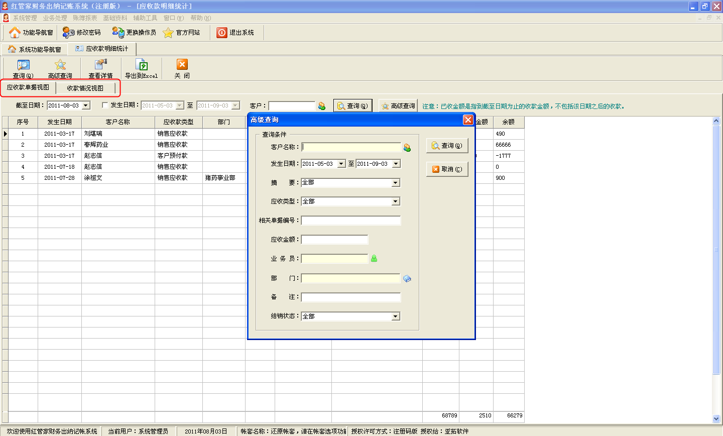 1、應收款明細表和應付款明細表增加“付款情況視圖”和高級查詢功能。