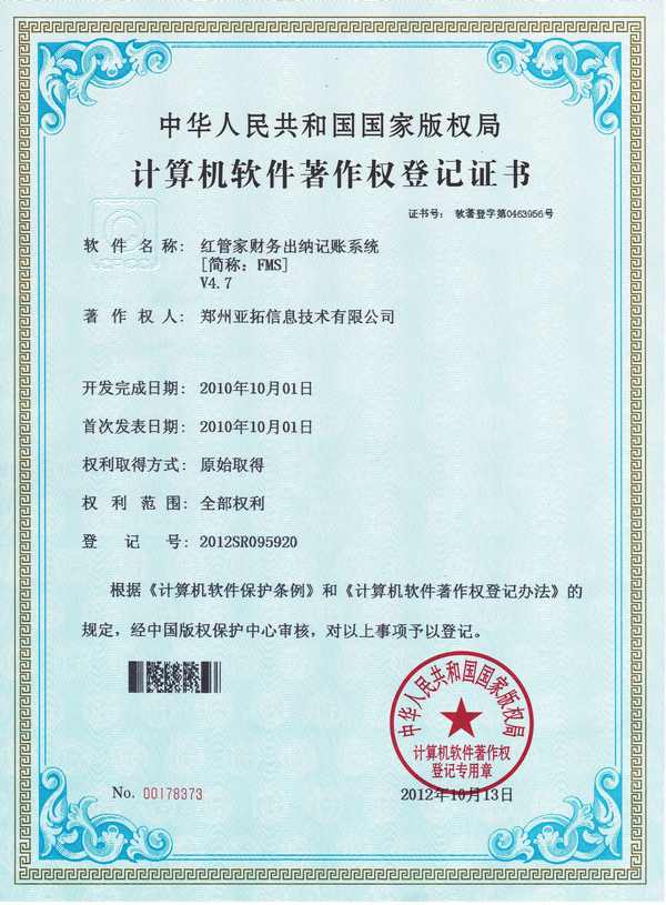2012年10月份,亞拓軟件開發的《紅管家財務出納記賬系統》最新版再次獲得國家版權中心軟件著作權證書(登記號:2012SR095920),可在國家版權登記中心網站的版權數據庫中進行查詢。獲得著作權認證標志這款軟件產品得到了專業級認可,部分源代碼在版權中心留存備案,體現了軟件產品的質量和可信度具有一定的保證,并且軟件的版權也將獲得法律保障!