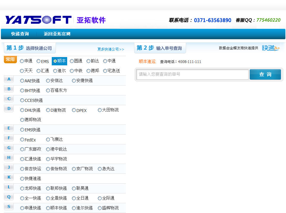 為了方便大家跟蹤我公司軟件產(chǎn)品配送情況,亞拓軟件官網(wǎng)增加快遞物流單查詢功能。我們非常理解大家購買產(chǎn)品后急切等待的心情,正如我們在淘寶網(wǎng)站上購買一件心意的寶貝一樣,有時還夾雜著一種不安的心情,擔(dān)心貨是否已經(jīng)發(fā)出、不會有問題吧、多長時間能到,時不時的會到物流網(wǎng)站上查看一下。 我們推出的這個快遞單查詢功能,直接接駁各大物流網(wǎng)站數(shù)據(jù),不需要輸入驗證碼,一站