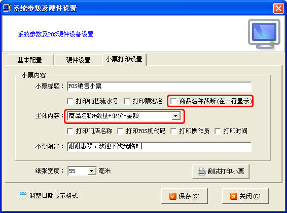 其中,是否打印銷(xiāo)售流水號(hào)、是否打印顧客名、是否打印門(mén)店名稱、POS機(jī)代碼、操作員、時(shí)間都可以進(jìn)行設(shè)置,打勾則系統(tǒng)會(huì)打印,不打勾則系統(tǒng)不打印。另外,系統(tǒng)也允許設(shè)置小票標(biāo)題和附注,具體對(duì)應(yīng)小票大哪個(gè)位置,請(qǐng)參見(jiàn)下圖。