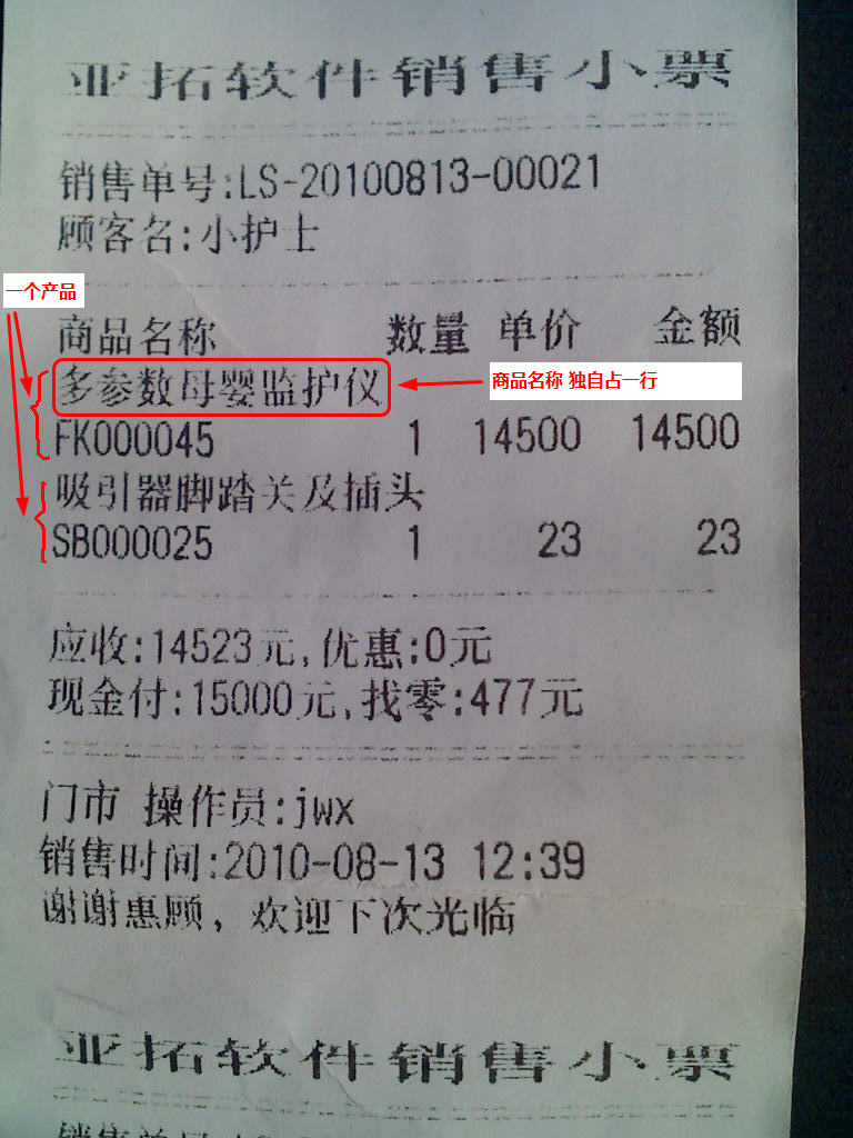 有關(guān)商品名稱截?cái)嗟膯?wèn)題,如果不復(fù)選“商品名稱截?cái)唷保瑒t系統(tǒng)打印出的效果為下圖所示,商品名稱單獨(dú)占一行,一個(gè)商品總共占兩行。