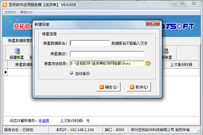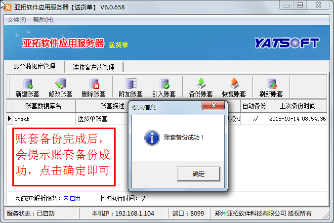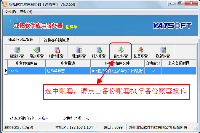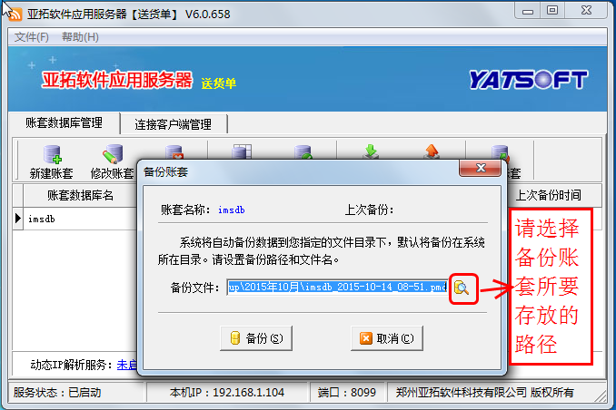 先在原主機(jī)上登錄軟件檢查下數(shù)據(jù),確認(rèn)沒問題后,打開亞拓軟件應(yīng)用服務(wù)器,在亞拓軟件應(yīng)用服務(wù)器上選中賬套,點(diǎn)擊“備份賬套”執(zhí)行備份賬套操作,點(diǎn)擊備份賬套后,會(huì)彈出“備份賬套”窗口,可以選擇備份文件所存放的路徑(一般情況下默認(rèn)存放在軟件的安裝目錄下DBBackup文件夾下),然后將剛才備份的賬套數(shù)據(jù)文件通過U盤或者移動(dòng)硬盤等方式拷貝到新主機(jī)電腦上。