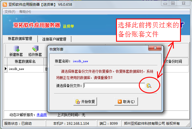 在新主機(jī)電腦上安裝軟件,打開亞拓軟件應(yīng)用服務(wù)器,然后點(diǎn)擊“新建賬套”,執(zhí)行新建賬套操作,賬套名為此前備份的賬套名,新建賬套完成后,選擇此新建的賬套,點(diǎn)“恢復(fù)賬套”,選擇此前拷貝過來的備份賬套文件進(jìn)行恢復(fù)數(shù)據(jù),數(shù)據(jù)恢復(fù)后,在登錄窗口選擇賬套登錄,檢查下數(shù)據(jù)是否完全恢復(fù)。