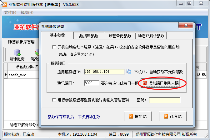主機(jī)沒問題后,客戶端電腦有時(shí)可能無法連接主機(jī),登錄失敗,此時(shí)請(qǐng)固定主機(jī)IP地址,另:打開亞拓軟件應(yīng)用服務(wù)器,點(diǎn)“文件”——》“系統(tǒng)參數(shù)設(shè)置”——》“基本參數(shù)”——》“添加端口到防火墻”。(為什么需固定主機(jī)IP地址及如何固定IP地址請(qǐng)參見這篇文章:網(wǎng)絡(luò)版軟件固定主機(jī)IP地址的方法)