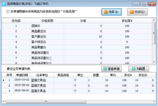 (2)我們以圖1中所設(shè)置的銷售價格啟用商品最近價、商品預(yù)設(shè)售價為例來開銷售出庫單,如下圖2而所示,當(dāng)我們選擇商品后軟件會根據(jù)啟用不同價格策略的優(yōu)先級自動調(diào)取商品的銷售價格,這次出庫單中由于這兩種商品之前已經(jīng)銷售過,所以軟件自動調(diào)取出商品的最近價。我們可以明細(xì)欄中點“更多操作”—》“選擇價格”中查看不同類別的價格以及最近業(yè)務(wù)單據(jù),如下圖3所示。