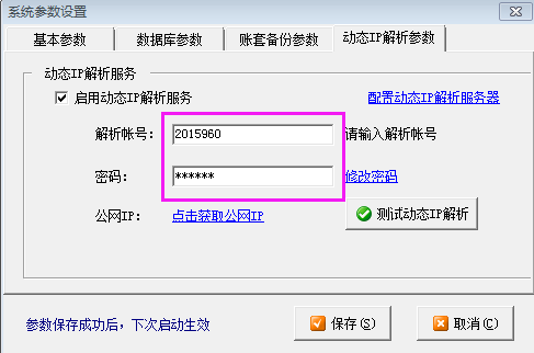 ②主機電腦配置動態(tài)IP解析服務(wù)參數(shù),并定時將公網(wǎng)IP地址信息發(fā)送給亞拓軟件云服務(wù)器。