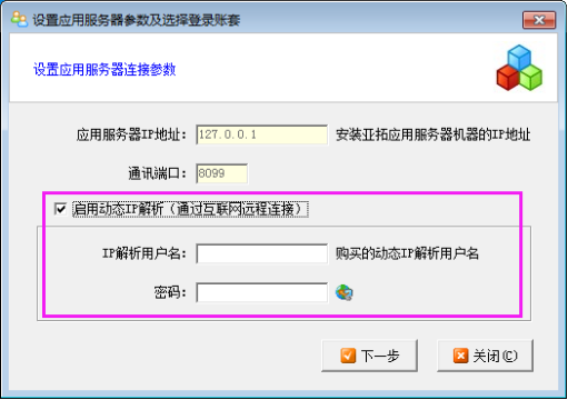 客戶端電腦登錄界面“選擇賬套”→“使用動態(tài)IP解析通過互聯(lián)網(wǎng)遠(yuǎn)程連接”,輸入IP解析賬戶和使用口令,點擊“下一步”,選擇賬套,選擇操作員并填寫密碼,進入軟件首頁。