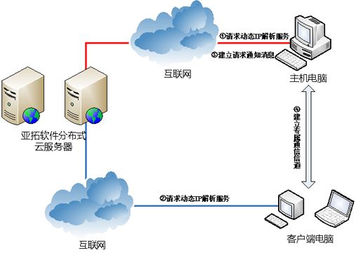 ①主機電腦向亞拓軟件云服務(wù)器發(fā)送動態(tài)IP解析服務(wù)請求。