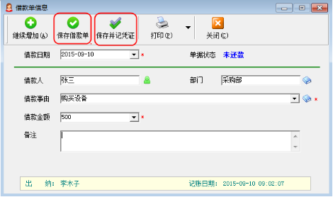 填寫完借款信息后點擊“保存借款單”,然后點擊“保存并記憑證”,如圖2所示,填寫憑證信息后保存憑證。