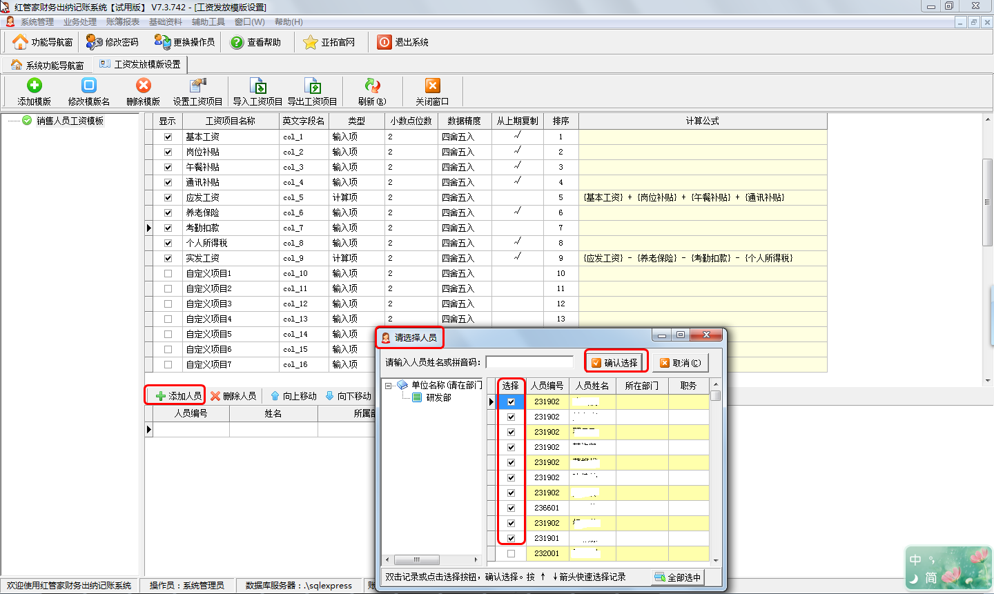 工資發放模板設置好之后,可以添加相應人員來按照此工資發放模板來計算工資,如下圖三所示。