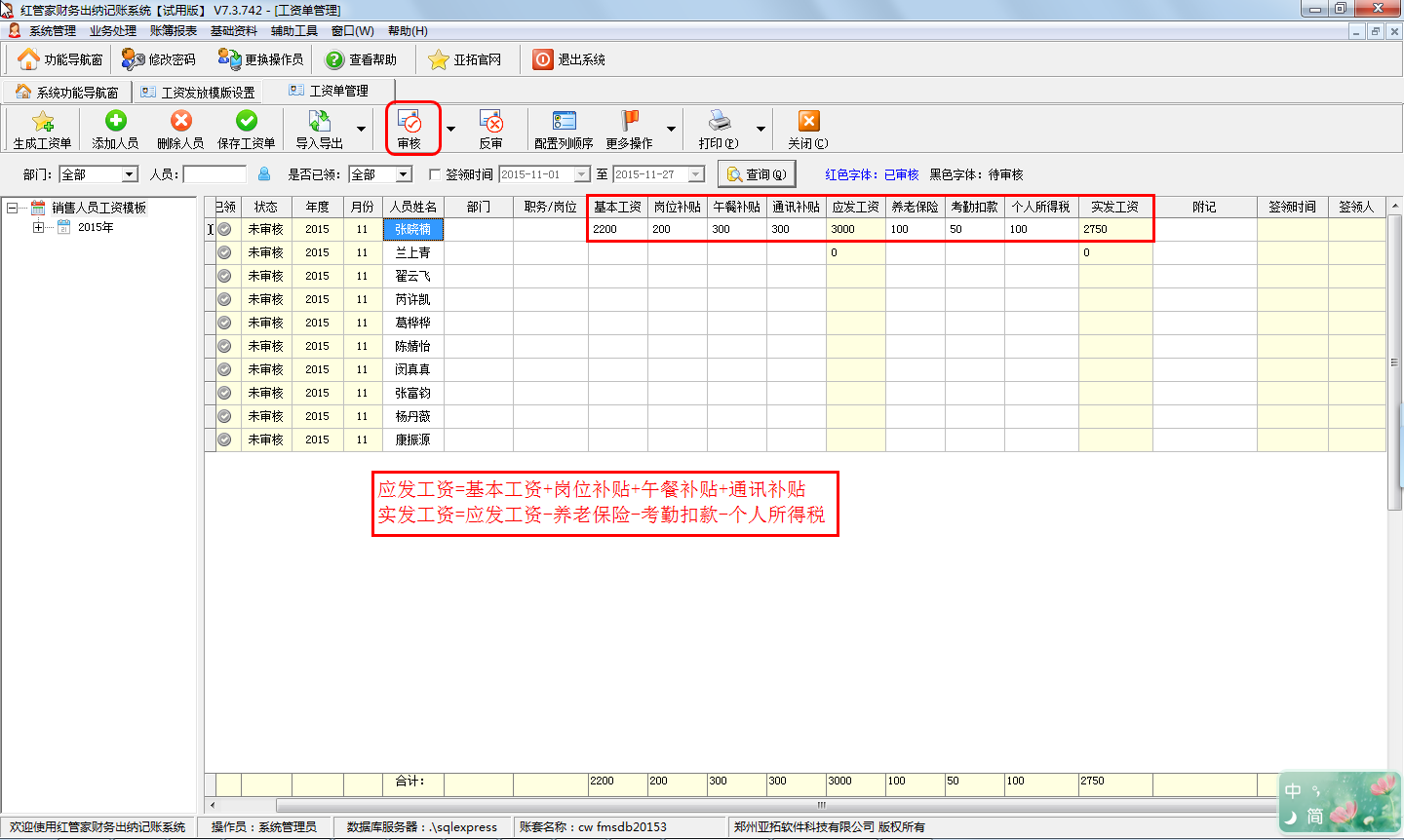 生成工資單之后,可以錄入基本工資、崗位補貼、考勤扣款等工資項目,然后系統可以根據您設置的工資發放模板計算出員工相應的應發工資及實發工資,確認正確后可以審核,如下圖五所示。