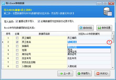 3、配置數(shù)據(jù)項與Excel中數(shù)據(jù)列的對應關系:點“下一步”按鈕配置“數(shù)據(jù)項”與Excel中的數(shù)據(jù)列之間的對應關系。點“自動對應”軟件會自動根據(jù)數(shù)據(jù)項名稱和數(shù)據(jù)列列名是否相同進行自動匹配。也可以按照下圖5所示手工選擇對應關系。