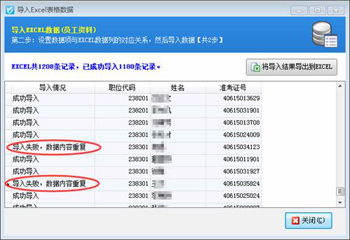 導入過程中軟件會實時顯示導入進度,如果數(shù)據(jù)量比較大時,導入進度達到100%時軟件進行數(shù)據(jù)提交會比較耗時。導入結束后,軟件會顯示導入的結果。沒有導入的記錄軟件會給出相應的原因,如下圖6所示。