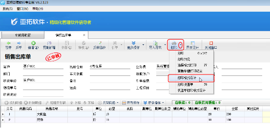 以亞拓管理軟件為例,在銷售出庫(kù)單界面上點(diǎn)“打印”—》“打印格式設(shè)計(jì)”進(jìn)入“銷售出庫(kù)單打印”窗口。如下圖所示: