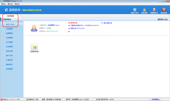 首先登陸亞拓管理軟件,點擊“功能導航窗”—“我的工作臺”,可以打開我的工作臺頁面,下圖為我的工作臺界面。