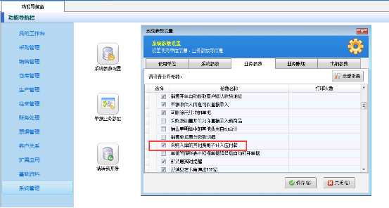 首先在功能導(dǎo)航窗點(diǎn)擊“系統(tǒng)管理”——》“系統(tǒng)參數(shù)配置”——》“業(yè)務(wù)參數(shù)”中打勾選擇“采購(gòu)入庫(kù)的其他費(fèi)用不計(jì)入應(yīng)付款”啟用此參數(shù)(注意:只有亞拓管理軟件專(zhuān)業(yè)版及以上版本可以啟用此參數(shù)),設(shè)置好之后點(diǎn)擊“保存”按鈕即可保存設(shè)置,如下圖一所示。