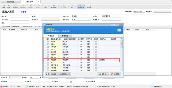 在功能導(dǎo)航窗點(diǎn)擊“采購(gòu)管理”——》“采購(gòu)入庫(kù)單”,打開(kāi)采購(gòu)入庫(kù)單界面,在界面設(shè)計(jì)中將“單據(jù)主體”及“單據(jù)明細(xì)”中“其他費(fèi)用”字段配置顯示出來(lái),“單據(jù)主體”中“其他費(fèi)用”取值方式取“采購(gòu)費(fèi)用”,如下圖二所示。