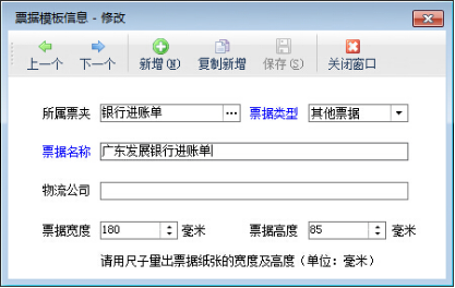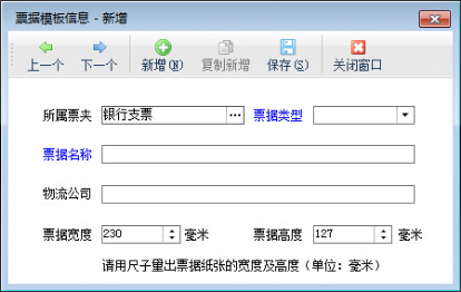 在“萬能票據(jù)打印”界面右側(cè)點(diǎn)擊“新增票據(jù)模板”按鈕,打開“新增票據(jù)模板”窗口,輸入模板信息后點(diǎn)擊“保存”按鈕即可在相應(yīng)的票夾下新增票據(jù)模板。