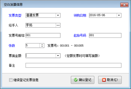 新增記錄:點擊“新增記錄”按鈕,進(jìn)入“空白發(fā)票信息”窗口,如圖2所示,其中“起始號碼”是必填項,其他內(nèi)容根據(jù)自己的業(yè)務(wù)需要進(jìn)行填寫,最后點擊“確認(rèn)登記”即可。