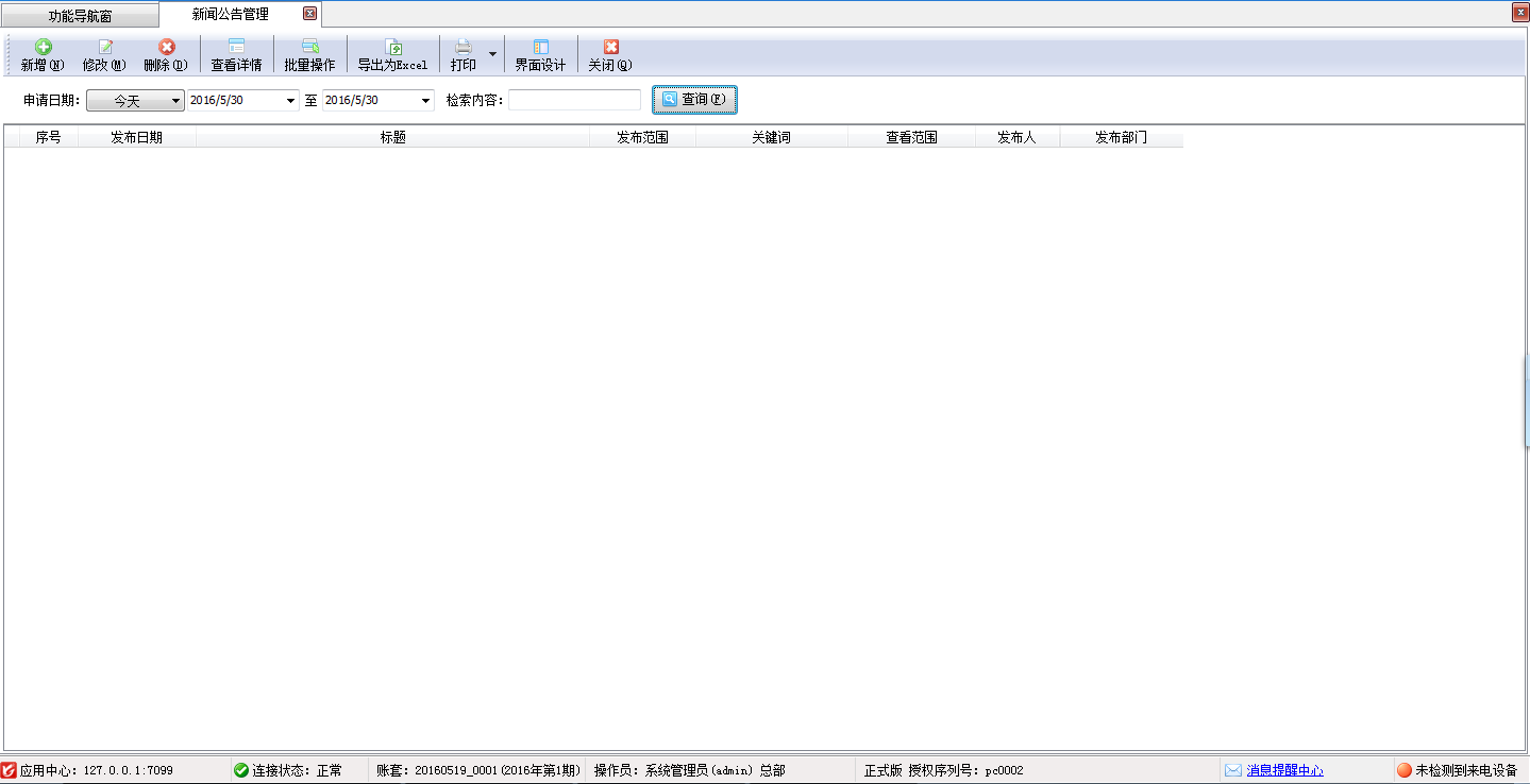 在功能導航窗點擊“擴展應用”—》“新聞公告管理”即可進入“新聞公告管理”界面,其界面如下圖所示:
