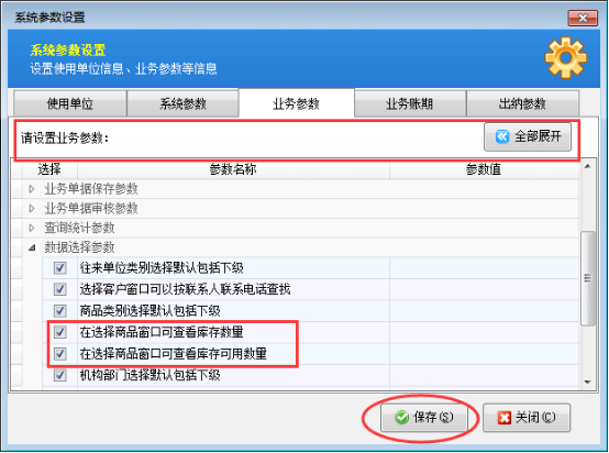 在功能導航窗,點擊“系統參數配置”—》“業務參數”選擇“數據選擇參數”進行設置,(為了更快捷的設置業務參數,可以先把設置業務參數“全部折疊”,直接查找“數據選擇參數”項),勾選參數后記得保存,具體操作如圖1所示: