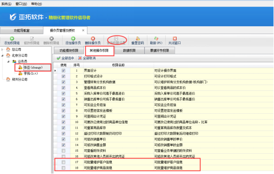 批量維護(hù)客戶資料需要操作員有操作權(quán)限,如何設(shè)置操作員有批量維護(hù)客戶信息的權(quán)限,操作步驟如下:系統(tǒng)管理員登錄軟件,打開“系統(tǒng)管理”→“操作員及授權(quán)”,選擇要添加權(quán)限的操作員,打開“其他操作權(quán)限”勾選上要選擇的權(quán)限,保存權(quán)限設(shè)置。具體如圖1所示: