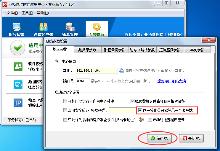 在亞拓管理軟件應(yīng)用中心內(nèi)點(diǎn)擊“系統(tǒng)參數(shù)”—》“基本參數(shù)”打開(kāi)“基本參數(shù)”設(shè)置界面,在“基本參數(shù)”設(shè)置界面打勾啟用“同一操作員只能登錄一個(gè)客戶端”,然后點(diǎn)擊“保存”按鈕保存設(shè)置,如下圖一所示。