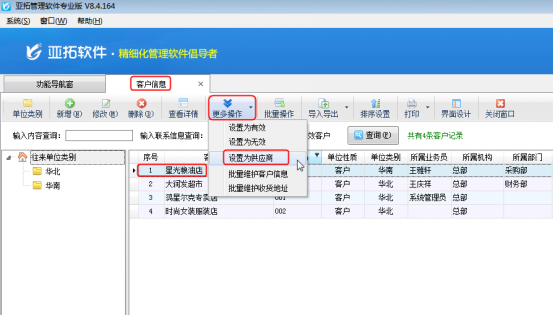 軟件支持批量操作,可以批量選擇多個客戶信息后,把多個客戶信息同時設(shè)置為供應(yīng)商信息,如圖4所示。