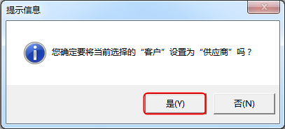 選擇一個客戶“星光糧油店”后點擊“更多操作”—》“設(shè)置為供應(yīng)商”,系統(tǒng)會彈出提示信息“您確定要將當前選擇的“客戶”設(shè)置為“供應(yīng)商”嗎?”,如圖2所示,點擊“是”按鈕,該客戶信息就轉(zhuǎn)變?yōu)楣⿷?yīng)商信息了。