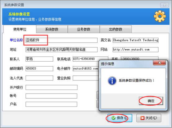 在“系統管理”—》“系統參數配置”中修改單位名稱為“亞拓軟件”,修改后記得保存。保存會提示“系統參數設置保存成功”。具體如下圖所示: