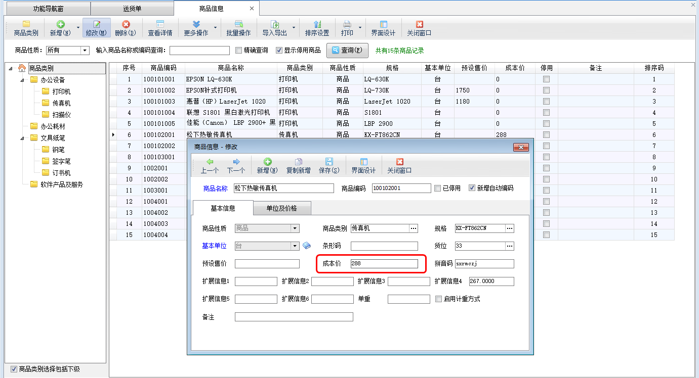 在功能導(dǎo)航窗點(diǎn)擊“基礎(chǔ)資料”—》“商品信息”打開商品信息主界面,修改商品“松下熱敏傳真機(jī)”成本價(jià)為288元,如下圖一所示。