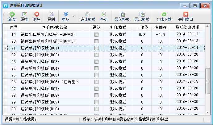 亞拓管理軟件、紅管家倉(cāng)庫(kù)管理軟件、紅管家送貨單軟件、紅管家出納記賬軟件等軟件內(nèi)都支持自定義打印格式模版,可以更方便、靈活的定制打印輸出內(nèi)容和格式,有時(shí)我們?cè)诖蛴∫活悊螕?jù)時(shí)可能會(huì)用到多個(gè)打印格式模版,其中一個(gè)打印格式模版為常用的,其他的為不常用的打印樣式,此時(shí)我們可以將常用的打印格式模版設(shè)置為默認(rèn),設(shè)置為默認(rèn)打印格式模版后打印單據(jù)時(shí)可以使用此默認(rèn)打印格式模版進(jìn)行快速打印。