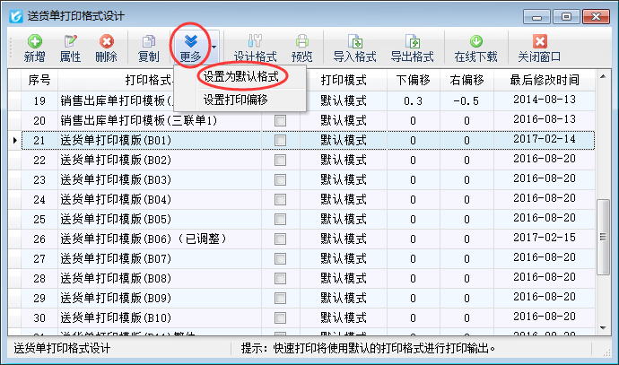 本篇文章以紅管家送貨單軟件為例介紹一下使用多個(gè)打印格式模版時(shí)如何將其中一個(gè)打印模版設(shè)置為默認(rèn)打印格式模版,打開(kāi)一個(gè)已保存的送貨單,在工具欄點(diǎn)擊“打印”—》“打印格式設(shè)計(jì)”(圖一)打開(kāi)“送貨單打印格式設(shè)計(jì)”窗口(圖二),選擇常用的打印格式模版,然后在工具欄點(diǎn)擊“更多”—》“設(shè)置為默認(rèn)格式”(圖三)可以將當(dāng)前打印格式模版設(shè)置為默認(rèn)打印格式,如下圖四所示。