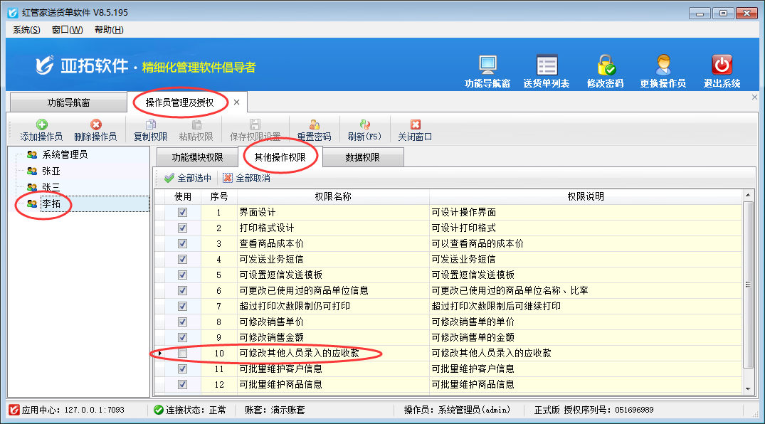 在功能導航窗點“系統(tǒng)管理”→“操作員及授權”即可進入“操作員管理及授權”界面,選中操作員賬號,在“其他操作權限”界面將“可修改其他人員錄入的應收款”權限打鉤取消,如下圖一所示,設置操作員賬號“李拓”不可修改其他人員錄入的應收款。