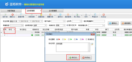亞拓管理軟件和紅管家倉庫管理軟件都可以對應(yīng)收款管理、應(yīng)付款管理進行標記備注。送貨單軟件的應(yīng)收款管理中也可以對應(yīng)收款進行標記備注。下面我們以亞拓管理軟件專業(yè)版為例,介紹對應(yīng)收款管理標記備注的操作步驟(應(yīng)付款和應(yīng)收款操作一致)。