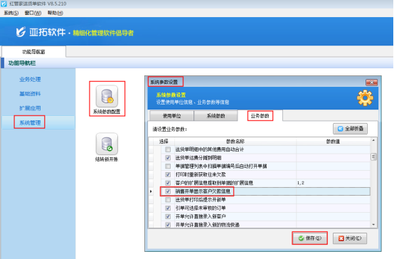 在功能導(dǎo)航窗點擊“系統(tǒng)管理”—》“系統(tǒng)參數(shù)配置”—》“業(yè)務(wù)參數(shù)”,即可進入到“業(yè)務(wù)參數(shù)”配置界面,在業(yè)務(wù)單據(jù)相關(guān)參數(shù)內(nèi)打鉤啟用“銷售開單顯示客戶欠款信息”參數(shù),然后保存,如下圖1所示。