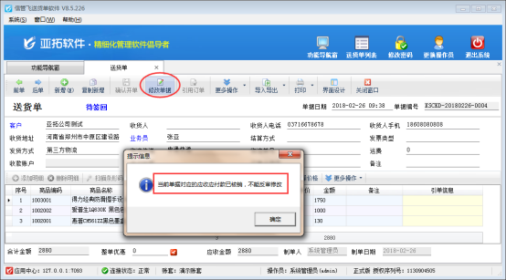 亞拓軟件自主開發(fā)的信管飛送貨單軟件、亞拓管理軟件等都支持將送貨單(銷售單)進(jìn)行收款結(jié)銷操作,有時可能存在送貨單商品明細(xì)開錯的情況。如果當(dāng)前送貨單的應(yīng)收款已結(jié)銷,軟件是不允許再修改此單據(jù)的,如下圖1所示: