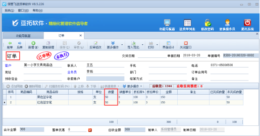 參數(shù)設(shè)置完成后,在功能導(dǎo)航窗點(diǎn)擊“業(yè)務(wù)處理”—》“新開訂單”,新增訂單,訂單內(nèi)容錄入兩條數(shù)量為“50”的商品,然后保存審核訂單,如下圖2所示: