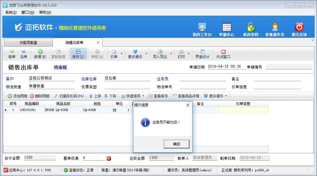 以信管飛倉庫管理軟件為例,示范下如果設置開銷售單時業(yè)務員允許為空。軟件安裝完成,系統(tǒng)參數(shù)設置默認業(yè)務員不允許為空,正常開銷售單,未在單據(jù)主體中輸入“業(yè)務員”,商品輸入完成后點擊“保存”按鈕,會提示“業(yè)務員不能為空”,如下圖1所示:
