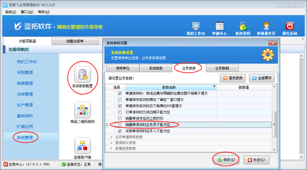 在功能導航窗選擇系統(tǒng)管理—》系統(tǒng)參數(shù)配置,即可進入“系統(tǒng)參數(shù)設置界面”,點擊業(yè)務參數(shù),在業(yè)務單據(jù)保存參數(shù)中找到“銷售單保存時業(yè)務員不能為空”參數(shù),把前邊的勾選符號去掉,然后保存,如圖2所示: