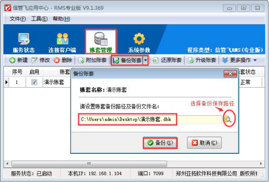 備份是在電腦的紅色應(yīng)用中心程序(應(yīng)用中心程序打開會在電腦桌面右下角顯示)上操作,打開紅色應(yīng)用中心程序,點擊“賬套管理”界面,選擇需要備份的賬套,點擊工具欄“備份賬套”,可以選擇備份的保存路徑,為了方便復制備份數(shù)據(jù),可以把備份文件保存在電腦桌面上,如下圖所示: