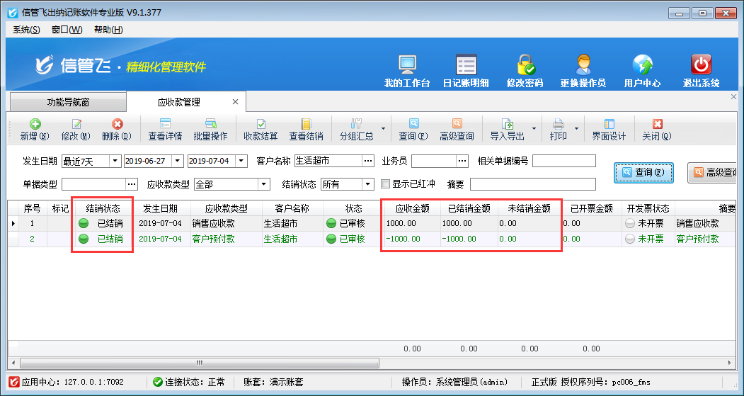 收款結算單單據審核之后,會更新應收款及預付款的結銷狀態,在應收款管理界面可以查看結銷情況,如下圖所示,剛剛新增的應收款及預付款記錄結銷狀態已更新為“已結銷”,此時未結銷金額為0。