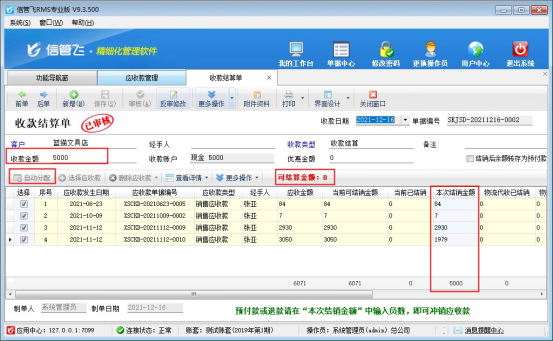 在收款結算單界面,默認是獲取此客戶所有未結銷的應收款。收款金額輸入本次收款5000元,然后點擊“自動分配”,可把收款金額分配到本次結銷金額明細中。分配完成后點擊保存并審核結算單。則本次收款完成,如下圖所示:
