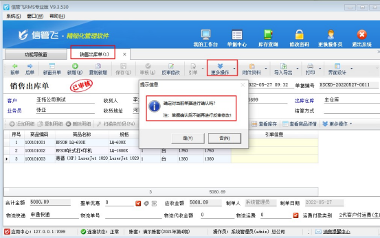 參數(shù)啟用完成后,銷售管理中新開(kāi)一個(gè)銷售出庫(kù)單保存并審核,審核完成后在更多操作下點(diǎn)擊“確認(rèn)單據(jù)”,確認(rèn)單據(jù)時(shí)會(huì)提醒“單據(jù)確認(rèn)后不能再進(jìn)行反審修改!”,點(diǎn)擊“是”確認(rèn)單據(jù)完成,如下圖: